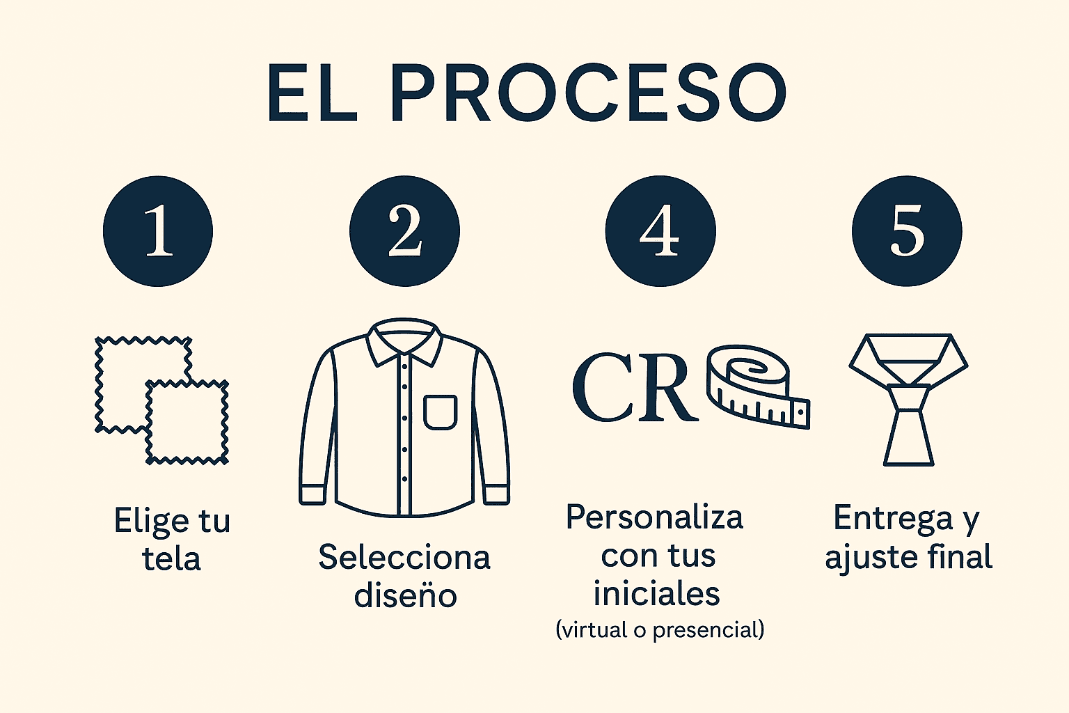 Cada prenda nace de un principio simple pero poderoso: no hay dos hombres iguales. Por eso, en lugar de producir en serie, diseñamos cada camisa pensando en quien la llevará —su personalidad, el ambiente donde se mueve, la ocasión que lo define.