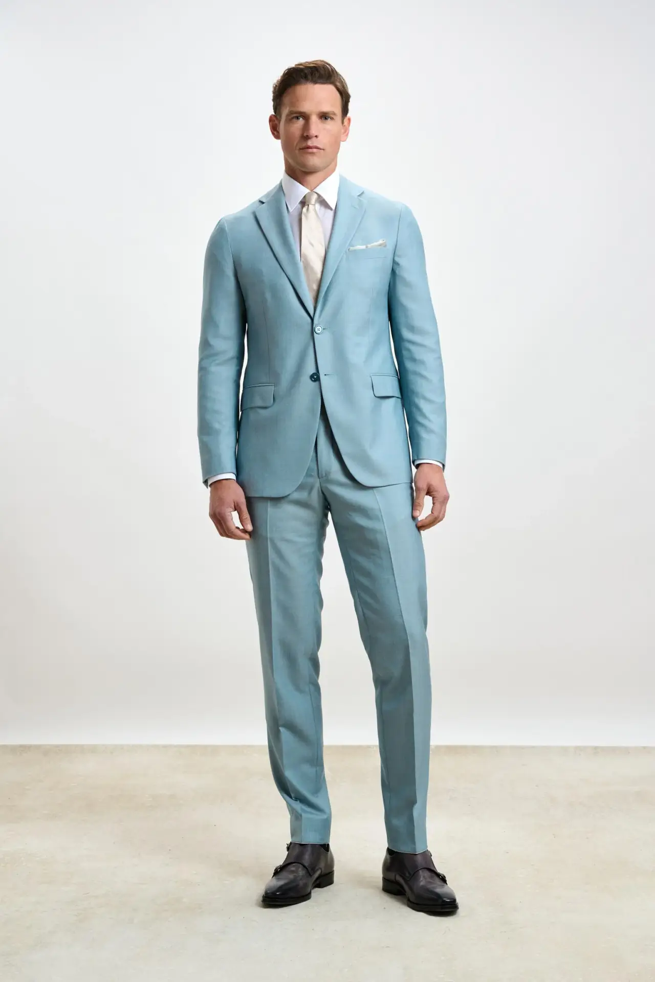 Inspirada en la forma en que la luz se refleja en el cristal, la colección Prisma es una selección concisa de trajes de verano ligeros en un arco iris de colores. Esta lana Super 120’ s tiene una urdimbre y una trama contrastantes; inusualmente, la trama es un hilo más claro y la urdimbre es de un color más oscuro. Esto añade un carácter único y da una apariencia tradicional de agua a las telas. El resultado es una colección contemporánea con un tacto suave y seco, lo que la hace ideal para trajes de verano.